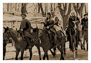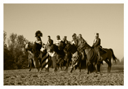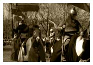 ![]() | VIII Turniej w Iłży Podobnie jak w roku poprzednim przyjęliśmy fabularyzowaną formułę turnieju. W tym roku preludium stanowiła produkcja filmowa, która wprowadzała główne wątki historii. Konflikt biskupa krakowskiego i niepokornego lennika - pana na iłżeckim zamku - przewijał się przez wszystkie pokazy turnieju. Pokazy konne poszerzył wspaniały pokaz łucznictwa konnego w wykonaniu naszych pań. Wieczorne bitwy to znowu potężne inscenizacje z udziałem dziesiątek walczących. Dodatkowym elementem był, bardzo barwny w swej formule, oddział chłopski i lekkozbrojny. |